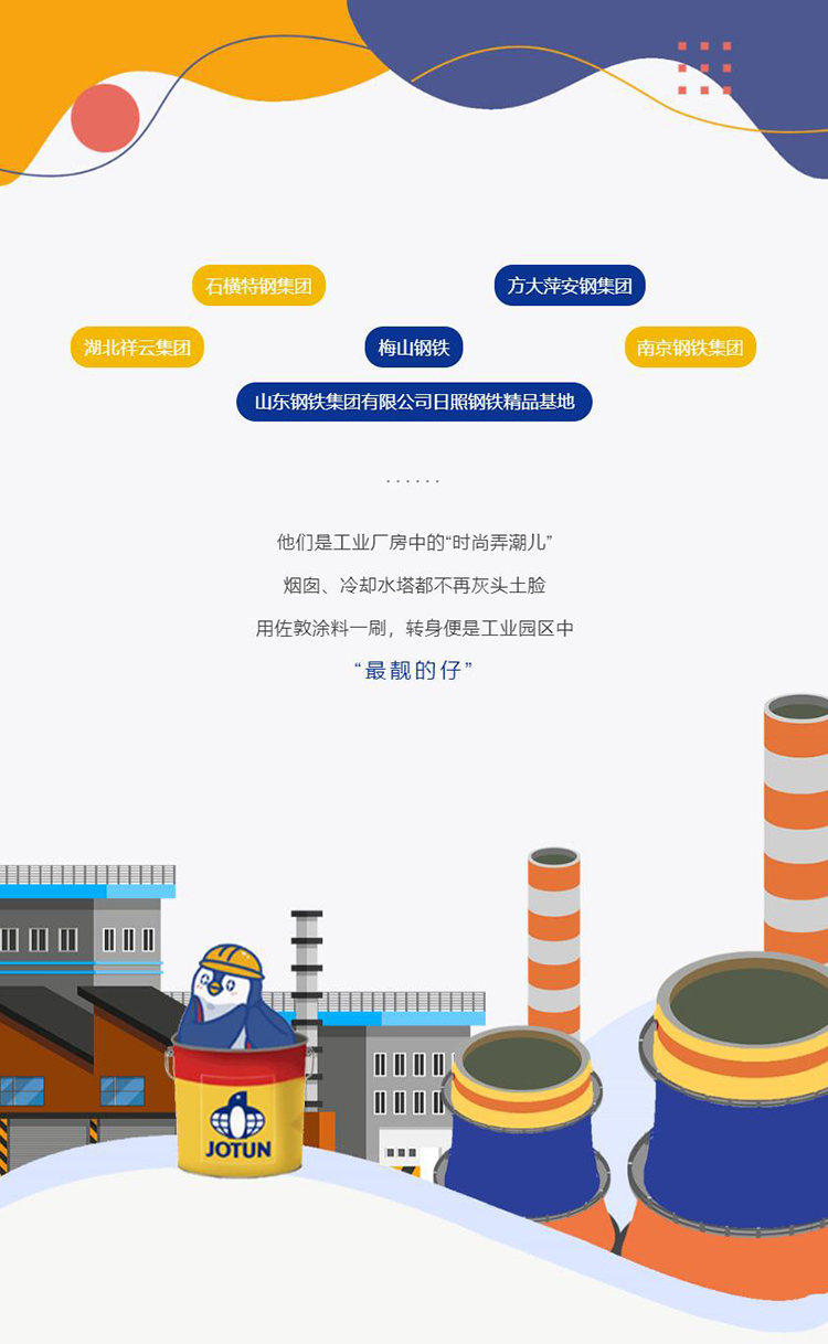 佐敦涂料攜手在業(yè)內(nèi)擁有超過(guò)30年高空施工經(jīng)驗(yàn)的施工團(tuán)隊(duì),為各類正在轉(zhuǎn)型的鋼鐵企業(yè)提供維修、防腐、美化服務(wù)。佐敦為此類美化服務(wù)提供專業(yè)的油漆配套,鋼廠美化專用的高性能涂料體系,不僅可以配合施工隊(duì)的快速施工,而且調(diào)色方便、調(diào)色空間大,能基于環(huán)保的基礎(chǔ)上更方便、精準(zhǔn)地展現(xiàn)出業(yè)主及設(shè)計(jì)師的設(shè)計(jì)理念。